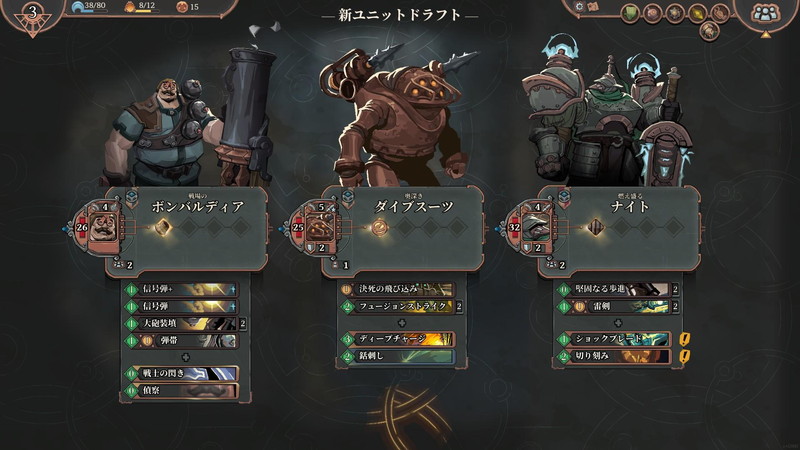 バトルではまずユニットを選択する。本作は体力の回復手段が絞られているため、できれば同じユニットを何度も使うのは避けたい。しかし、カードがユニットに紐づいているため、デッキが育っていないユニットで戦闘するのもリスキーであるという点が面白い。