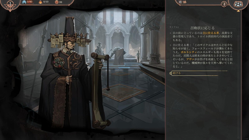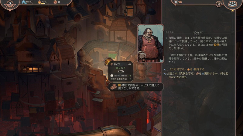 「仲間」は多様なイベントを起こすためのカードだ。筋力・知世・風格のパラメータがあり、イベントごとにそれらを参照して、ダイスロールを行い、結果に応じて報酬を得ることができる。このゲームの会話UIは『ディスコ・エリジウム』を参考にしていると思われ、その遊びもTRPG的だ。