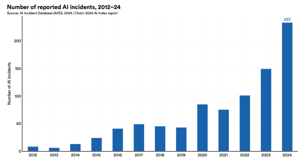 第3章「責任あるAI」では、AI活用に伴う社会問題とその対処方法・事例をまとめている(※4)。AIの悪用を伴う事件は、2012年から2024年までに増加の一途をとどっており、2024年には233件であった。もっとも、この件数は大きく報じられた事件にもとづいており、実際に起こっているAI悪用事例の氷山の一角とみなすべきである。