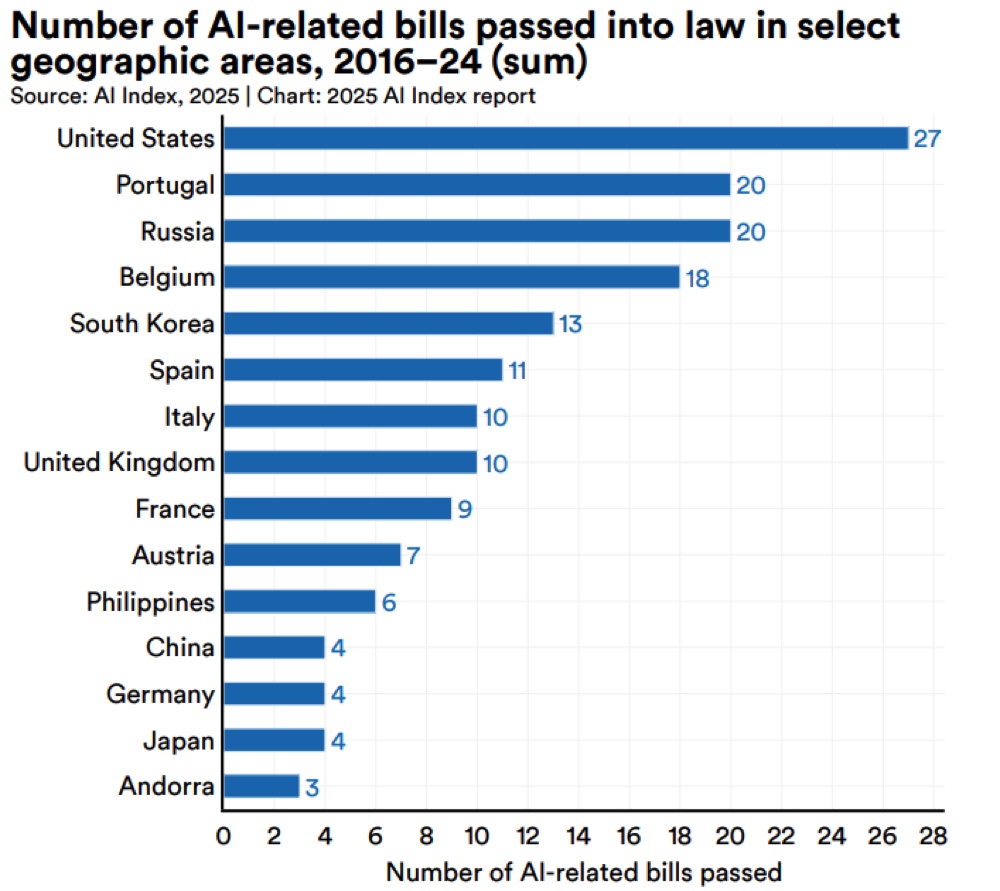 第6章「政策とガバナンス」では、以上のようなAIの悪用に対する各国のAI規制の現状をまとめている(※6)。2016年から2024年までにおける成立したAI関連法を国別に集計すると、アメリカが27件、次いでポルトガルとロシアの20件と続く。日本は中国やドイツと同じ4件であり、AIが普及している割にはAI関連法の数が少ないことがわかる。