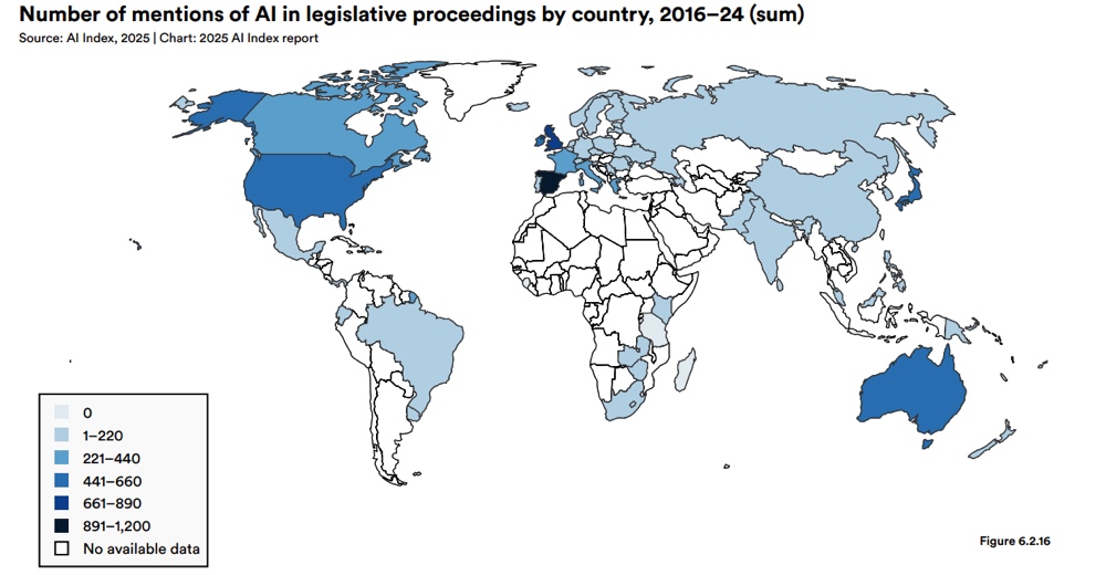 2016年から2024年において、各国の国会でAIが言及される回数を集計してグラフ化したのが、以下の画像である。1位はスペインの1200回、2位はイギリスの710件であった。日本もAI言及数が多い国のひとつであることがわかる。
