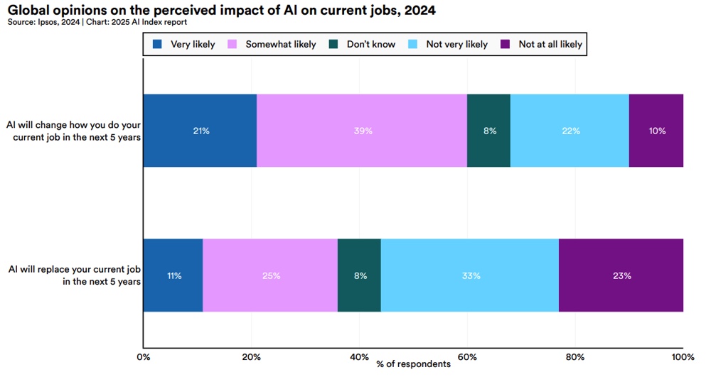 仕事に対するAIの影響に関するアンケート調査も実施された。具体的には「AIは5年以内にあなたの仕事の仕方を変えるか」と、「AIは5年以内にあなたの仕事を代替するか」という質問を尋ねた。前者については「非常にそう思う」と「いくらかそう思う」の合計が60%だったの対して、後者は36%であった。この結果より、多くの国民がAIによって仕事の仕方は変わるものの、失業するとまでは思っていないことが判明した。