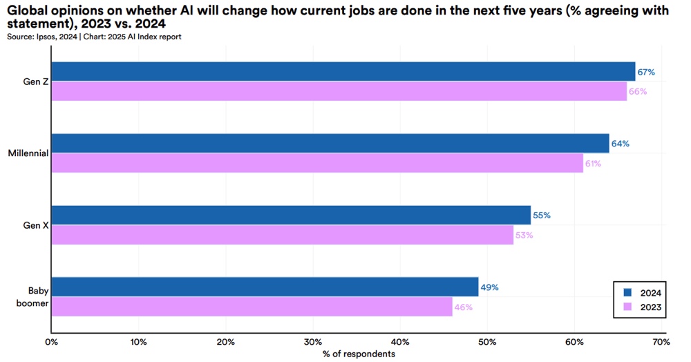 前述の「AIは5年以内にあなたの仕事の仕方を変えるか」という質問に対して肯定的に答えた回答者を世代別に集計したのが、以下のグラフである。若い世代ほどAIによる変化を強く感じており、ベビーブーマー世代(日本における“団塊の世代”)が49%なのに対して、Z世代は67%であった。