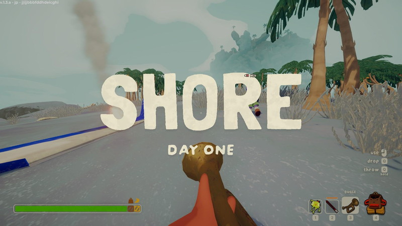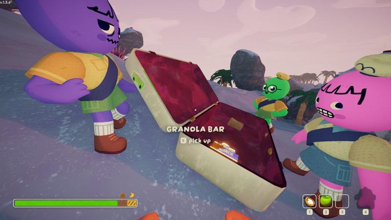 本作を成り立たせている要素は、画面左下のスタミナゲージである。プレイヤーたちは最初はスタミナがマックスの状態で始まるが、アイテムを入手すると重量が加算され、スタミナの最大値が削られる。また、時間経過で空腹になるので、その分だけまたスタミナの最大値が削られていく。そんな具合で、落下ダメージであったり、毒であったり、火傷であったりと、様々な問題に直面するたびにスタミナゲージがゴリゴリと削られていくのだ。