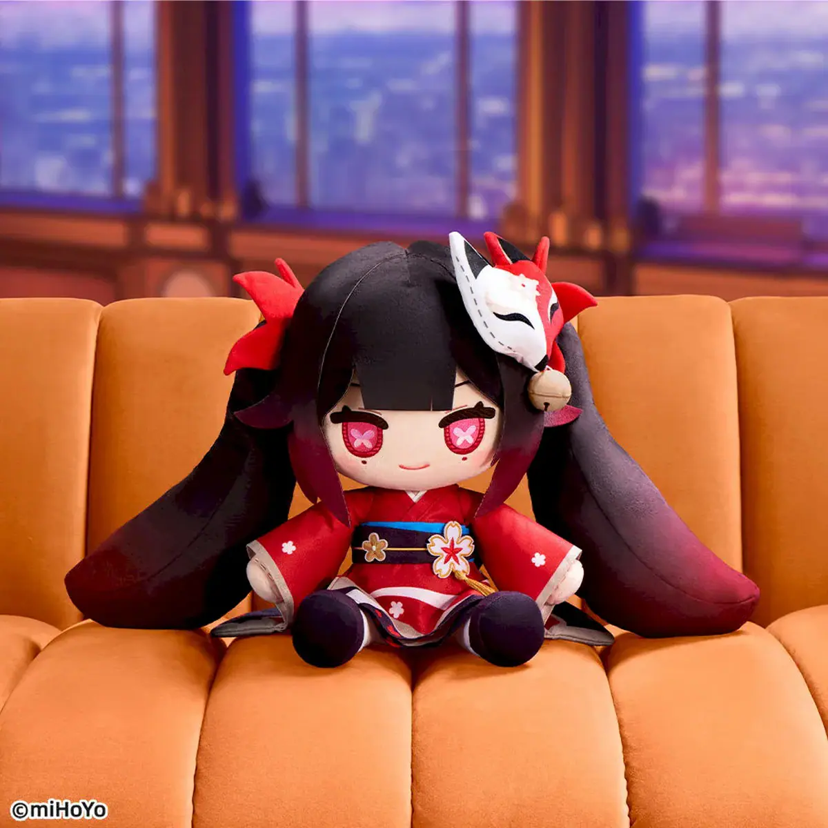 全長は約35×16×30cmで、特徴的な瞳や髪色のグラデーション、着物や面など細部に至るまで精巧に再現した本商品。ふわっとした佇まいながら、不敵な笑みを浮かべるかのような表情は存在感バツグン。ストーリーのように爆弾としての機能は備えておらず、あくまでぬいぐるみなのでインテリアにもぴったりだ。