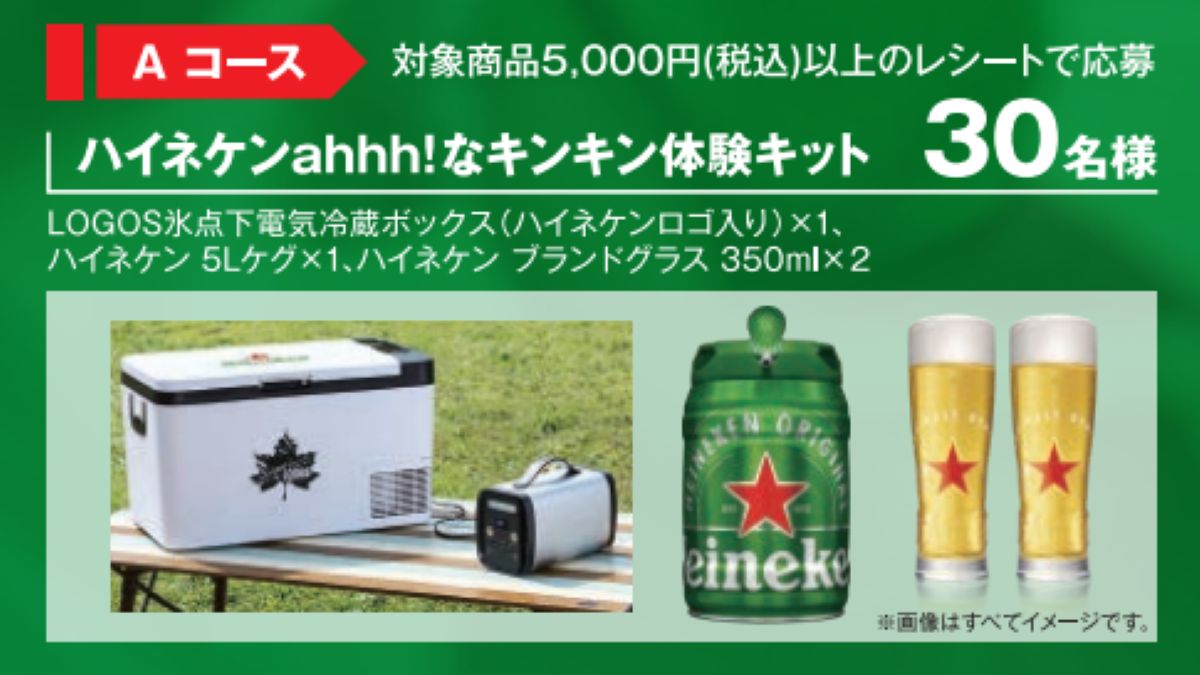 賞品は購入金額に応じて2つのコースに分かれている。ひとつは、対象商品を5,000円以上購入した応募者を対象としたAコースで、「ハイネケンahhh!なキンキン体験キット」が抽選で30名にプレゼントされる。