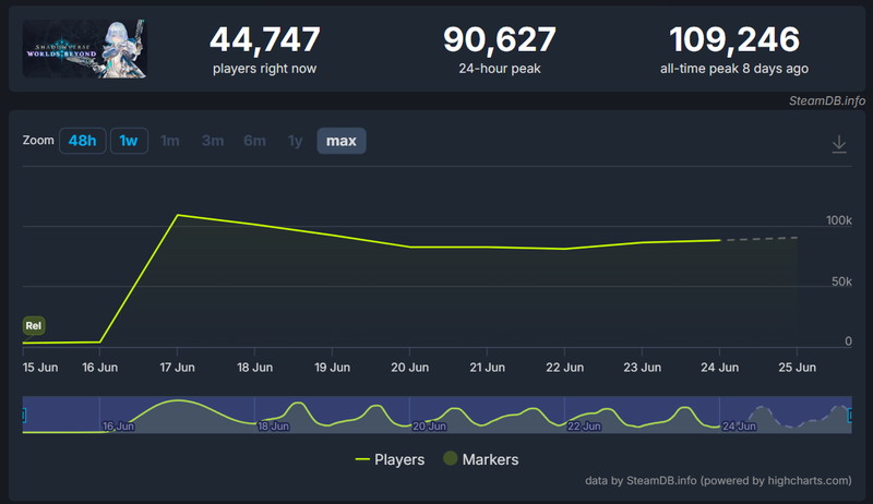 一連の取り組みが功を奏してか、『シャドバWB』は多くのユーザーを獲得しつつある。Steamプラットフォームにおけるさまざまなデータを閲覧できる外部サイト・SteamDBによると、同タイトルの同時接続プレイヤー数は、リリース日の6月17日に11万へと迫った。サービス開始直後の特需が落ち着いた6月22日には、8万強まで数字を落としたが、その後はふたたび増加傾向に。記事執筆時点では、ウィークデーであるにもかかわらず、9万弱まで回復させている。