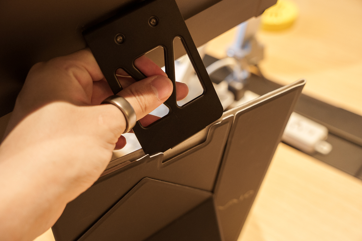 専用ケースは、ちょっとクセのある折りたたみ式ではあるけれど、慣れれば問題なし。ノートPCの画面上にモニターをタテ配置できる、いわゆる“上下2画面スタイル”が再現できるのがとても便利。