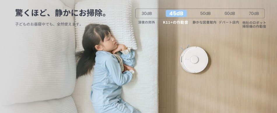 新型の『K11+』は、従来モデル『K10+』よりもさらにコンパクトに設計され、直径24.8cm、高さ9.2cmという世界最小級のボディを実現。これにより、家具の隙間や狭小スペースでも自在に動き回り、壁際や角などの取りこぼしがちな部分までしっかり清掃可能だ。