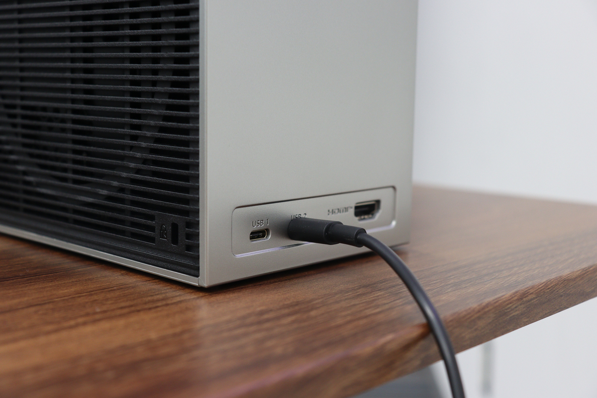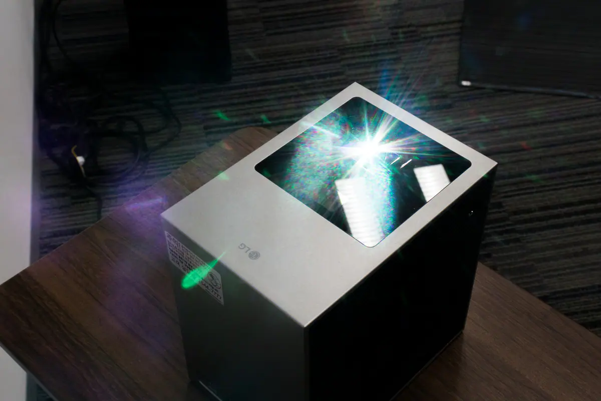 『LG CineBeam S』は、幅110×奥行160×高さ160mm、重さ約1.9kgというコンパクトサイズで、片手でひょいっと持ち運べる手軽さが魅力。デザインもスッキリしたミニマル仕上げなので、使わないときは部屋の隅に置いておけば、インテリアに自然と溶け込んでくれる。