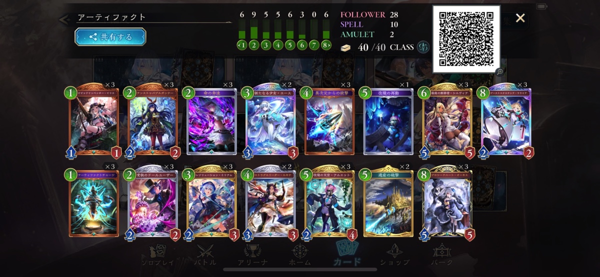 持ち込んだデッキはアーティファクトネメシス。試合の中でさまざまなルートを取れるため、1デッキのみの持ち込みという条件なら個人的にアーティファクトネメシス一択だった。中身はレバンガ北海道・rikka選手の構築を参考に、《遺産の砲撃》を2枚投入した構築だ。ランクマッチではロイヤルと人形ネメシス相手にほぼ無敗だったこともあり、「ロイヤル、ウィッチ、ネメシスが多い」という読みも頭にはあった。実際はそんなこともなかったのだが……。