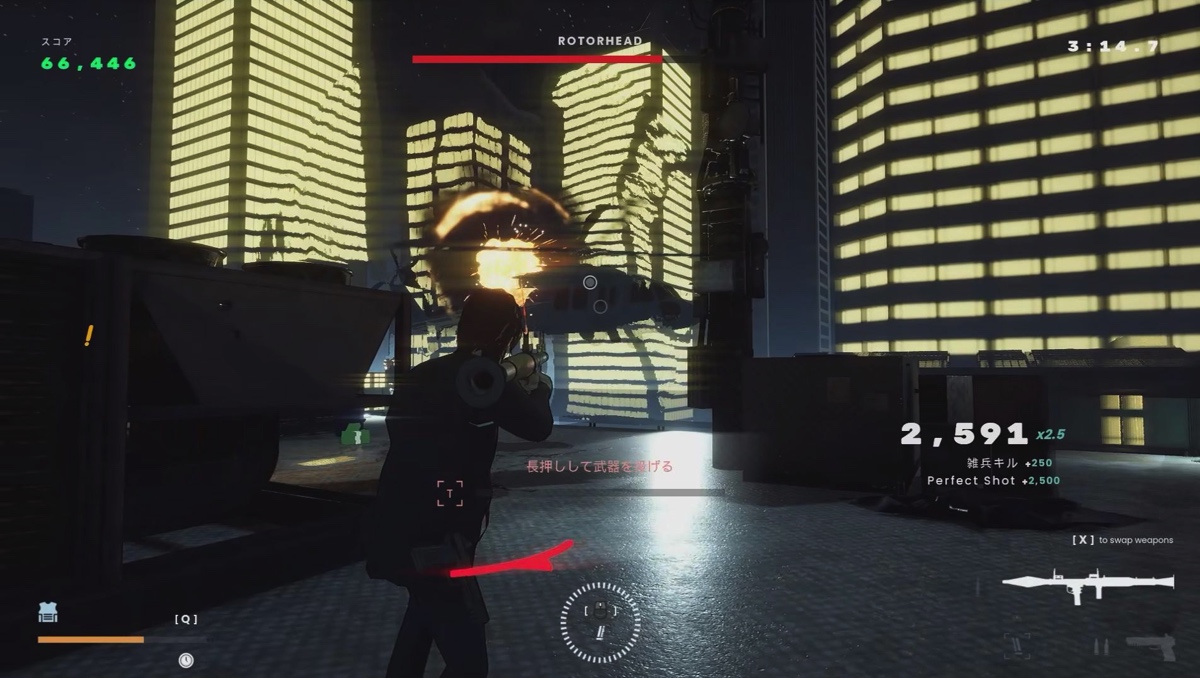 前章で述べた視点切り替えをはじめ、スキルは多数用意してある。その一方で、スキルをすべて使うように強いていない。敵より早く撃ち、敵の攻撃をよければ何とかなる。あとはおまけなのだが、プレイヤーが腕前にあわせて使うスキルをチョイスすると自分好みの画面映えを得られる、というのが面白い。なりきりアクションとして遊びやすいのだ。