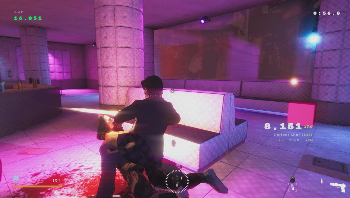 上から見下ろす画面で主人公は小さいが、戦闘中のモーションはまさにジョン・ウィックでなじみ深い。ショットガンでふっとび、刀で切断欠損するなど、リアクションが細かく効果音も心地よい。どこかしら見覚えのあるロケーションにもニヤニヤできる。物騒なクラブから美術館、豪邸での大立ち回りだ。それっぽいサントラも加わり、銀幕チックな暗殺者の世界をかもし出す。