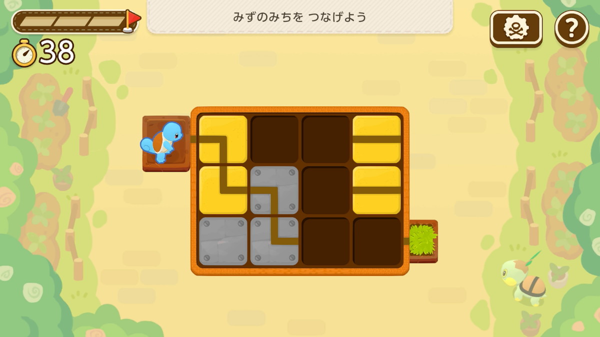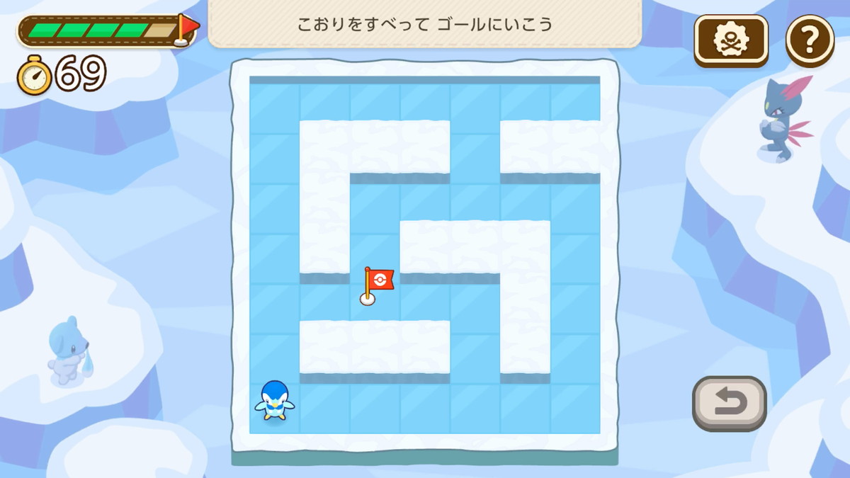 ピカチュウを操作してマス目のなかに配置された電球を一筆書きで点灯させていく問題や、ポッチャマとつるつる滑る氷の床の迷路を解く「こおりのぬけみち(※1)」風の問題など、ポケモンたちの特徴を活かした、“楽しくて少しだけ頭を使う、ユニークな問題”を多数収録。頭を使うことを意識せず、遊びのなかで自然と頭を使う設計になっている。