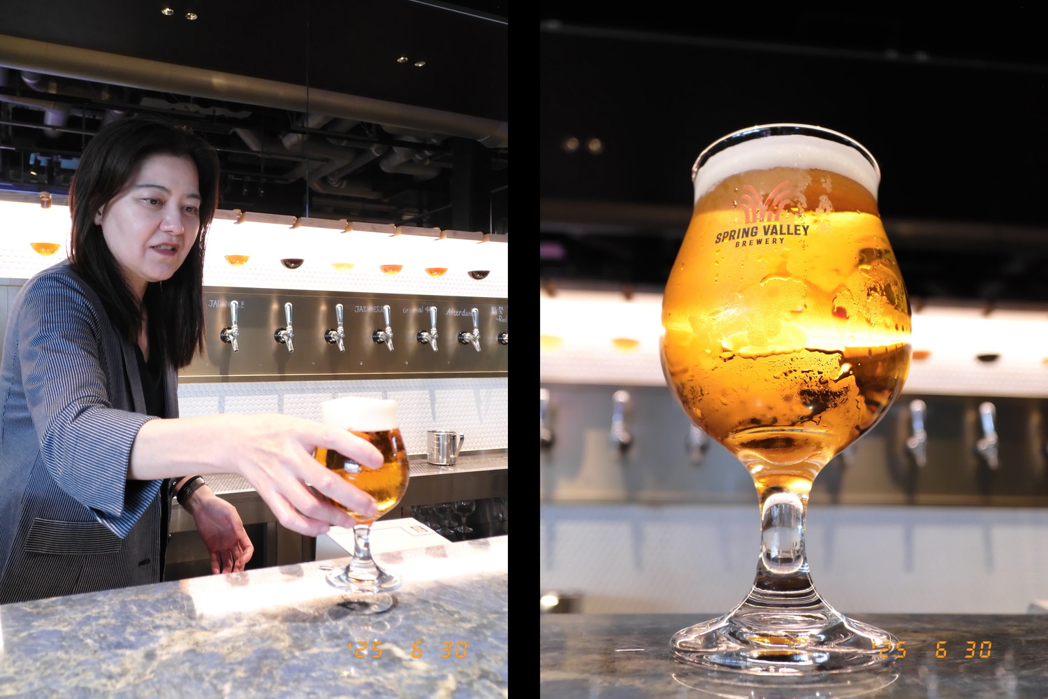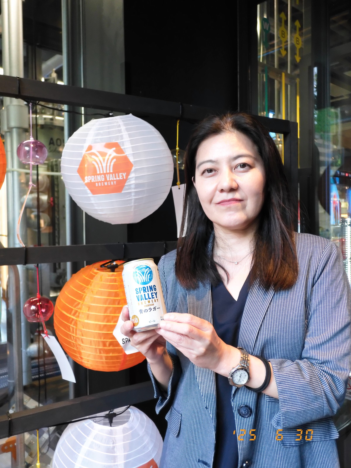 「さあ、何をどんな風に撮って遊ぼうか?」と考えていた取材班の前に「SPRING VALLEY BREWERY 青のラガー」(以下、青のラガー)缶ビールを手に降臨したのは、なんとSVBの井本亜香社長であった!