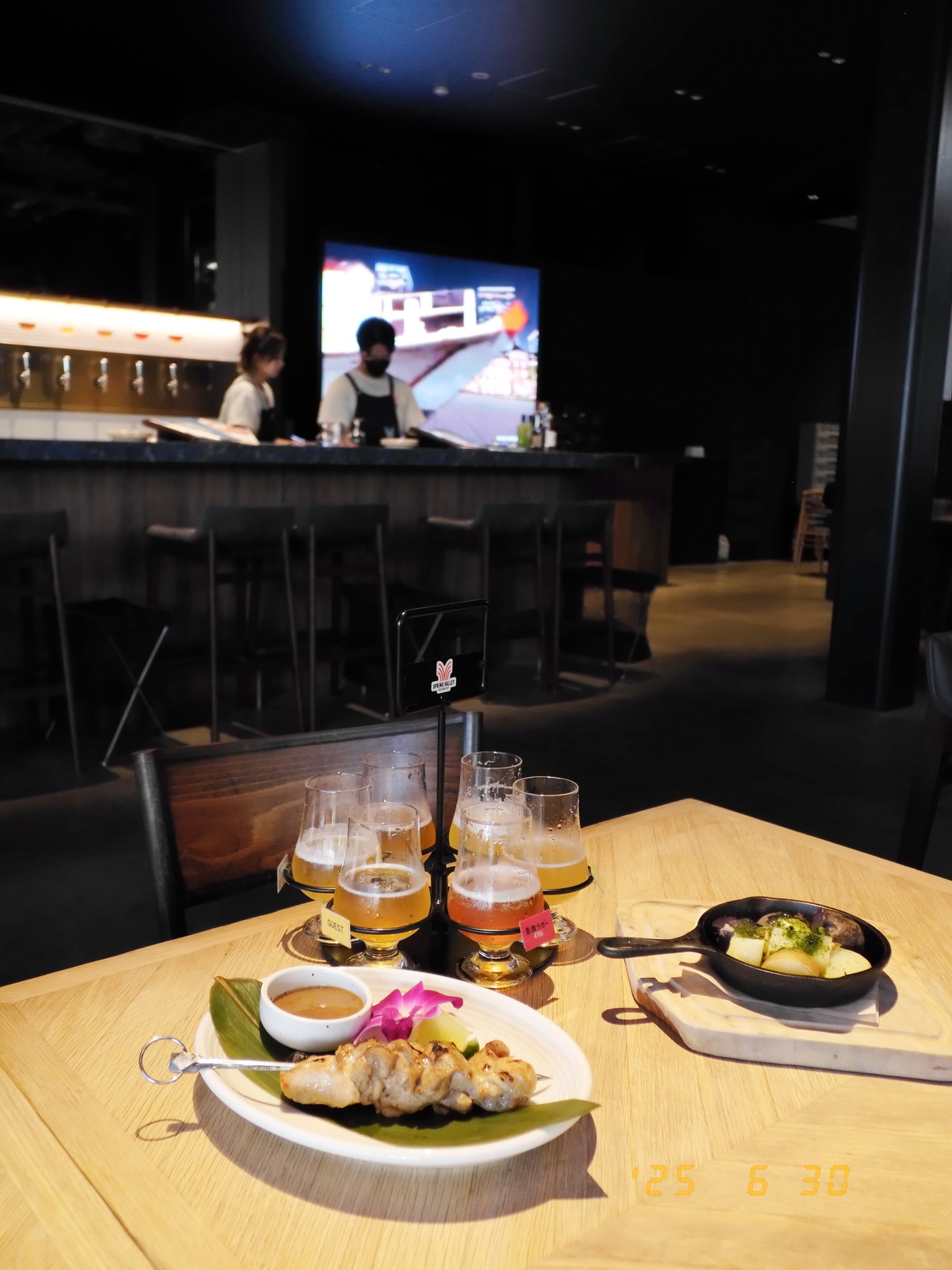 - 「SVB流屋台飯」の一例。「サテ・アヤム~串焼きココナッツ風味~」(1300円)、「磯のりたっぷりWクイーンじゃがバター」(850円)と「青のラガー」は好相性