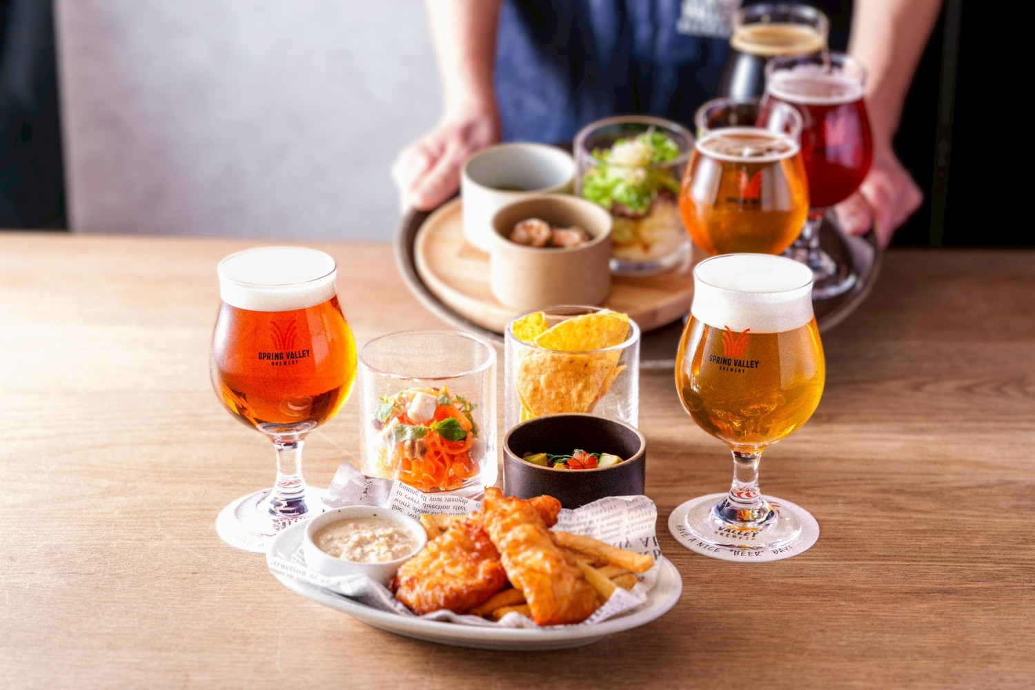 クラフトビールの2時間飲み放題「シグニチャーCOMBO」(下写真は2人前)も人気。定番ビール7種におつまみ「スターター一品+フィッシュ&チップス」でお一人3800円。一品料理を追加しておいしい時間を楽しもう!
