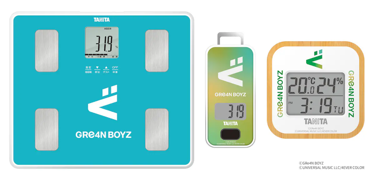健康総合企業の株式会社タニタは、人気ボーカルグループ・GRe4N BOYZ(グリーンボーイズ)とコラボレーションした商品を発売する。商品化するのは、GRe4N BOYZのメンバーが音声でナビゲーションする音声体組成と、グループのロゴをあしらった3D(3軸加速度)センサー搭載歩数計、デジタル温湿度計の全3アイテム。価格は音声体組成計が2万2000円(税込)、歩数計が3520円(税込)、温湿度計が3520円(税込)。7月24日午後2時からタニタオンラインショップ(https://shop.tanita.co.jp/)で予約を受付中だ。予約の締切は8月25日14時で、商品の発送は11月下旬以降を予定している。