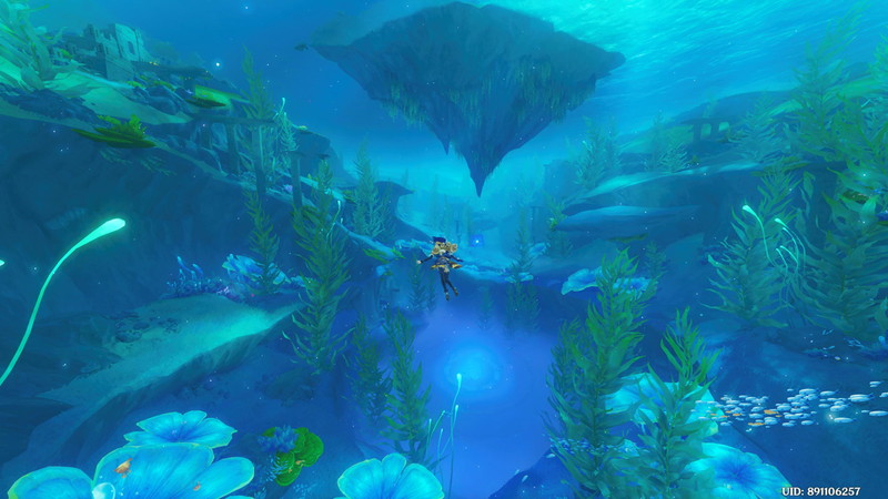 最初に、筆者を特にとりこにさせたフォンテーヌの水中について触れたい。ナヴィアに会うため順を追ってフォンテーヌにたどり着くことを楽しみにしていた。だが、どうしてもストーリーを体験するより先に水中へ行ってみたかったのだ。なぜなら、動画で見たフォンテーヌの水中の景色があまりにも美しかったからだ。水と絡み合った美しい建物や景色に目を奪われながらも、一目散に水中へ飛び込んだ。