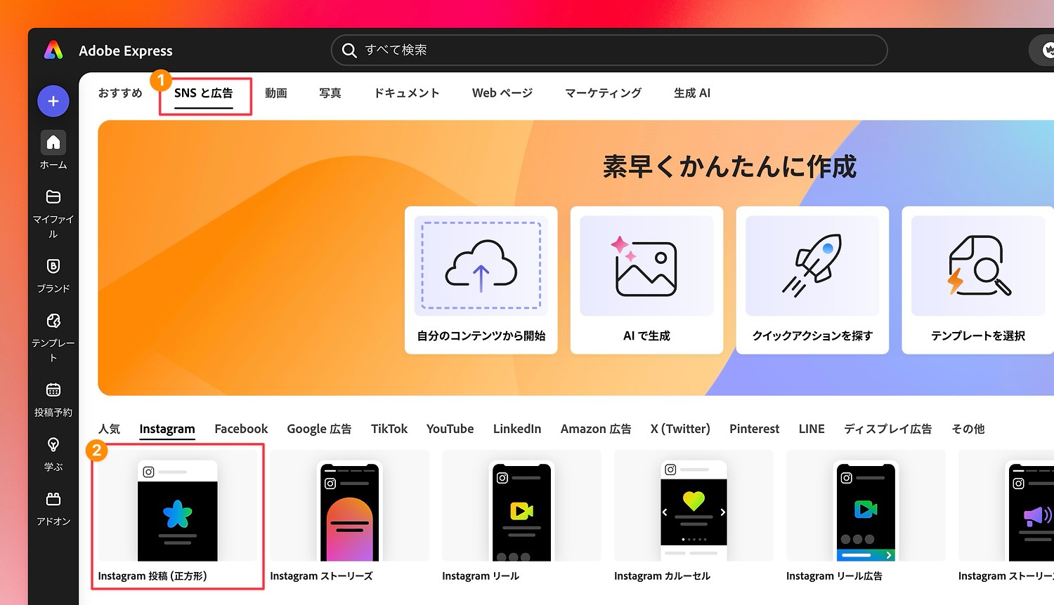 まずは『Adobe Express』にアクセスし、画面上部のタブバー(おすすめ / SNS / 動画 / …)からデザインの用途に合わせてフォーマットを選ぶのがおすすめだ。今回はInstagramのフィード投稿を例に進めていきたいので、〈SNS〉→〈Instagram 投稿(正方形)〉と選択。