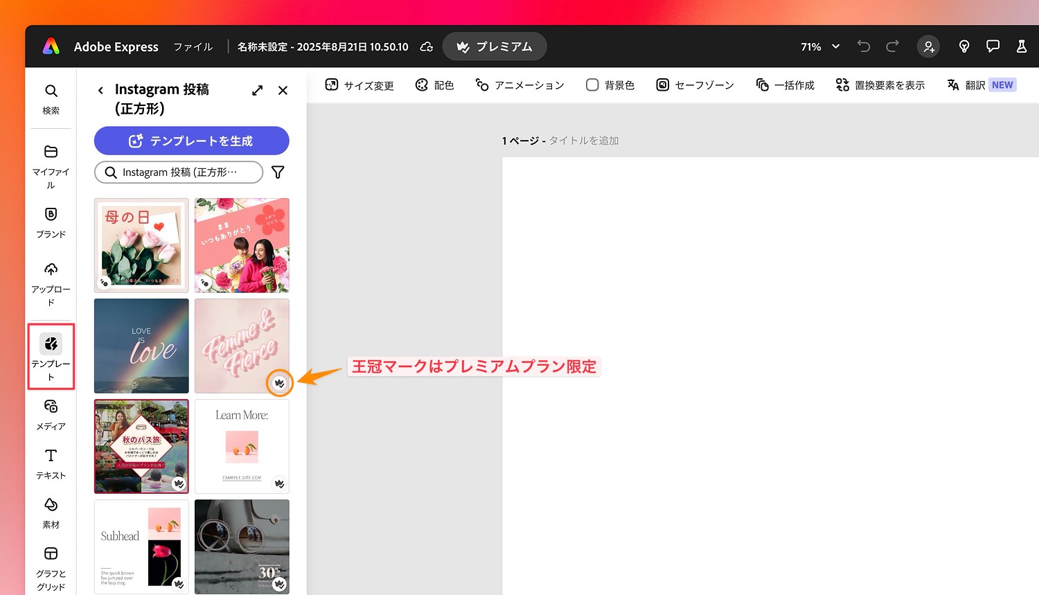 早速デザイン画面が表れるので、まずは画面左側のテンプレートの一覧から作りたいデザインに近いものを選ぼう。なお紫の王冠マークがついているものに注意。選択はできるが、プレミアム(有料)プランのユーザーのみが書き出し(.jpgや.pdfとして保存)できるテンプレートなので、無料プランで利用する場合は王冠マークがついていないものから選択しよう。