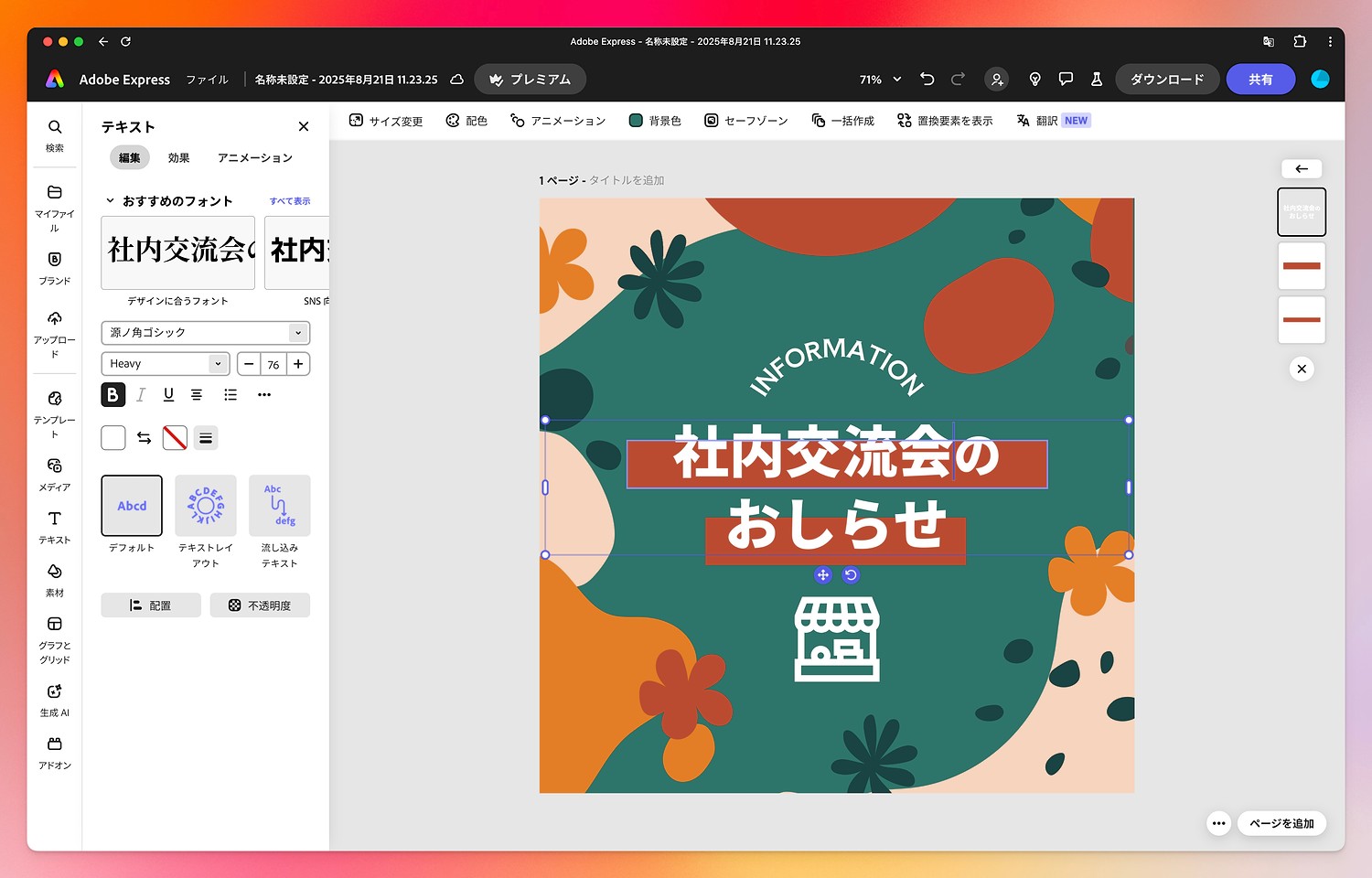 テンプレートを選んだら、まずはテキストの内容を変えてみる。編集は簡単で、変更したいテキストボックスを選択して文字を入力するだけ。
