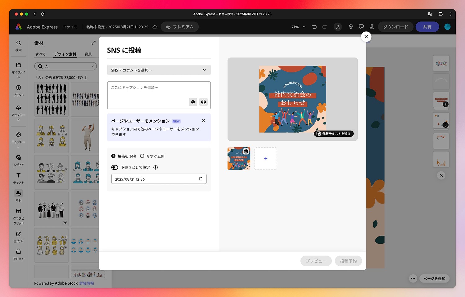 『Adobe Express』で作ったデザインは各種SNSへシームレスに投稿できるのも便利だ。画面右上の〈共有〉ボタンから〈SNSに投稿〉を選択すると、InstagramやXをはじめとするSNSアカウントとの連携が可能。キャプションの追加や投稿予約といった機能も利用可能で、しっかりと運用していきたいビジネスアカウントの投稿を作るのにも最適だ。