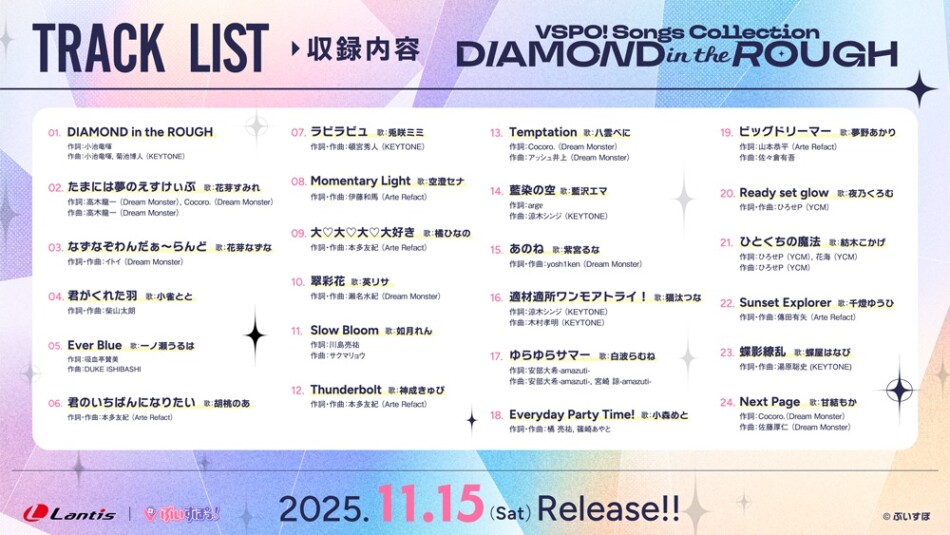 なお、収録楽曲は11月22日〜24日に「LaLa arena TOKYO-BAY」で開催される『ぶいすぽっ!フェス 2025』内のライブイベント『DIAMOND in the ROUGH』で初披露予定だ。