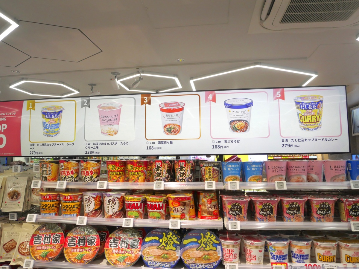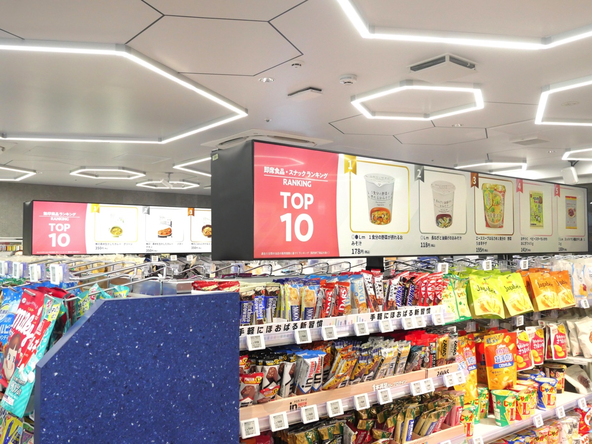 そして個人的にかなりよかったと感じたサービスが、棚の前に立つとおすすめ商品やランキングがAIサイネージに表示される、というところだ。体感だが、30秒〜1分ほど棚の前に立っていると、ランキングが表示される。筆者はコンビニを利用する際は目的もなく入ることが多い。このランキングがあれば何を買うか迷う時間を短縮できるため、かなりありがたい。