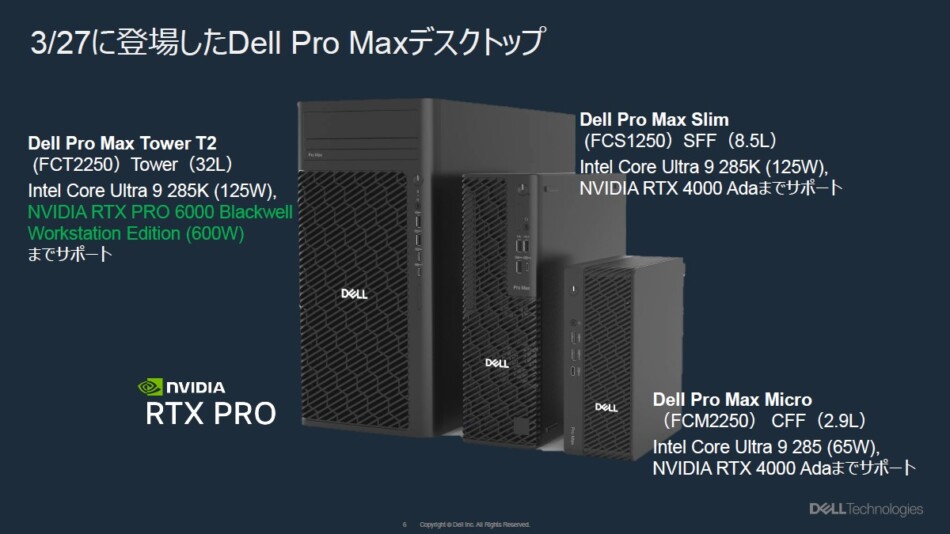 すでに「Dell Pro Max」はデスクトップ製品が発表されているが、最上位のTower T2は発表時には選択できなかったNVIDIA RTX PRO 6000 Blackwell Workstation Editionまで対応するようになったという。