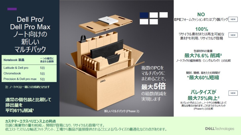 リサイクルコバルトやリサイクル鉄の採用に加え、企業向けに調達台数が多いことを想定して新たに採用したPhese 2のマルチパックも紹介した。これは最大5台のノートパソコンを一つの段ボール箱に格納することで100%リサイクル可能なほか、パレタイズも従来よりも最大75%向上したという。