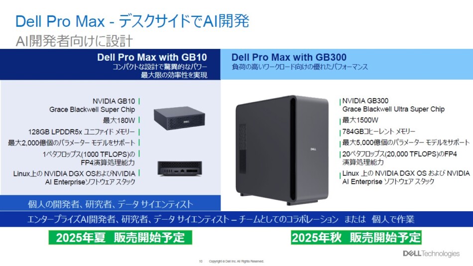 AI開発者向けに設計されたNVIDIAのGB10を使用した『Dell Pro Max with GB10』を今年夏、NVIDIA GB300 Grace Blackwell Ultra Super Chipを使用した『Dell Pro Max with GB300』を今年秋までに販売を開始したいとAIに対する取り組みについても紹介された。今後発表する「Dell Pro Max」がQualcommのNPU「Qualcomm AI 100 PC Interfence Card」を搭載するモデルであることも明かされた。推論に特化したNPUを使用することで現在のCopirot+PCの規定の数倍の性能を発揮し、Local AIの処理速度を大きく加速するだろう。