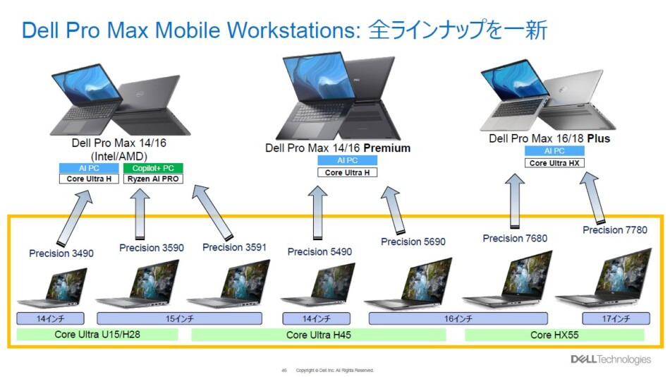 製品の詳細に関しては徳山氏が解説。従来の「Precision」の3000シリーズが「Dell Pro Max」の無印に、5000シリーズがPremium、7000シリーズがPlusとなるという。従来は15/17インチ製品があったが、「Dell Pro Max」では14/16/18インチ製品が投入される。