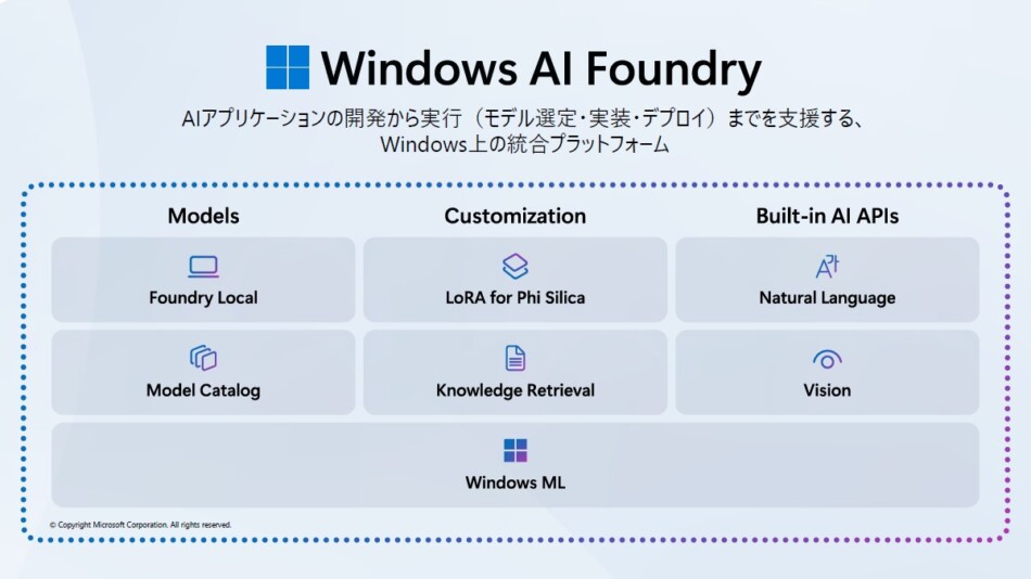 そしてWindows AI FoundryというAIアプリケーションの開発から実行までをサポートするプラットフォームも紹介した。