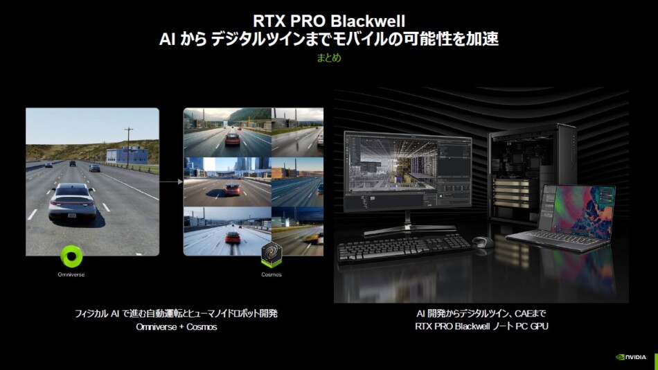 従来ワークステーション用GPUはQuadroというブランドを使用していたが、現在はRTX PROという名称となっている。現在は500/1000/2000/3000/4000/5000と6ラインナップがあり、モバイルPCでもAIからデジタルツインまで幅広い用途に応えられると紹介していた。