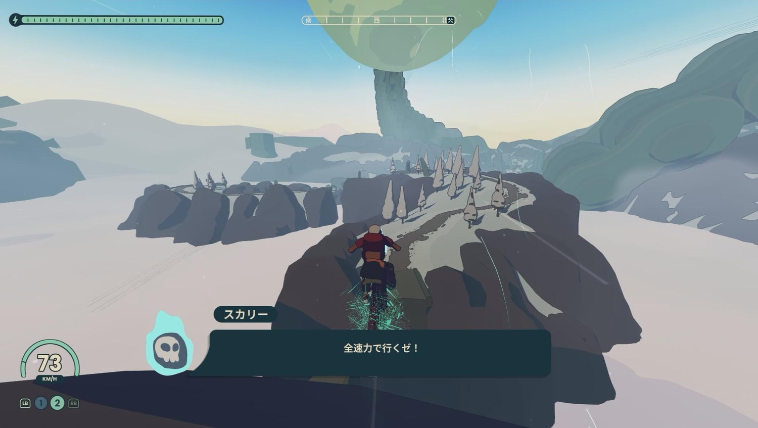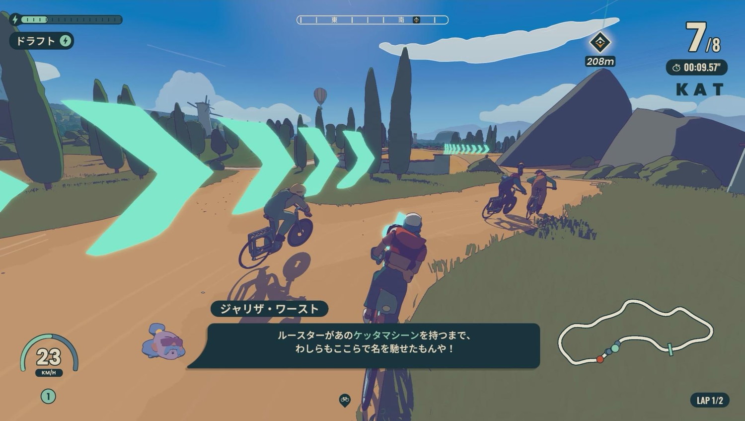 ゲーム展開はレースで名声ポイントを稼ぎ、地元名士への挑戦権を得てこれに勝利する、という流れだ。オープンフィールドの各地に点在するレースチームを探すのが主目的となる。道中を自分の足で漕ぐことになるが、ただ移動するだけで楽しい。マップで目的地を決めて直進するもよし。道なりに心ゆくまで流すもよしだ。