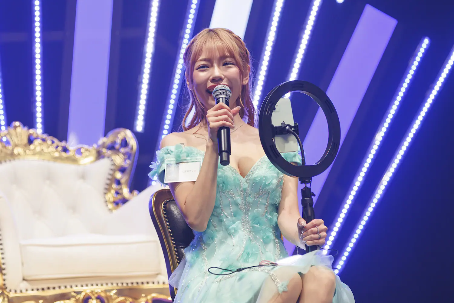 会場内にはブルーカーペットが敷かれ、ネオン演出がきらめくなか、ステージ上にはピラミッド状に組まれた「特別席」が設けられていた。そこに座ることができるのは、イベント中のバトルで上位に入賞したライバーのみ。最上段の“頂点の席”は、最終的に1位を獲得したライバーのもとへと渡る。