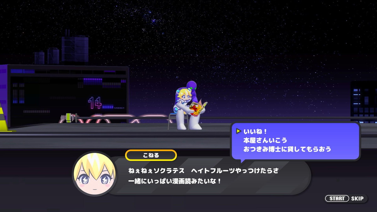 またステージに落ちているドーナツを5個食べると、一定時間無敵になる「るんるんモード」に突入。スピードやジャンプ力が上昇し、触れただけで敵を倒せるなど爽快感抜群の体験も可能だ。このように、システムごと「こねるに振り回されるデート感」が本作の醍醐味だと感じた。こねるは好奇心旺盛で天真爛漫な性格で、プレイヤーとソクラテスは彼女の気まぐれに付き合いながら、デートを進めることになる。まるで隣にいる彼女に振り回されているかのような感覚を味わえ、目当ての効果が出なくても「しょうがないな〜」と思えるような仕掛けだ。