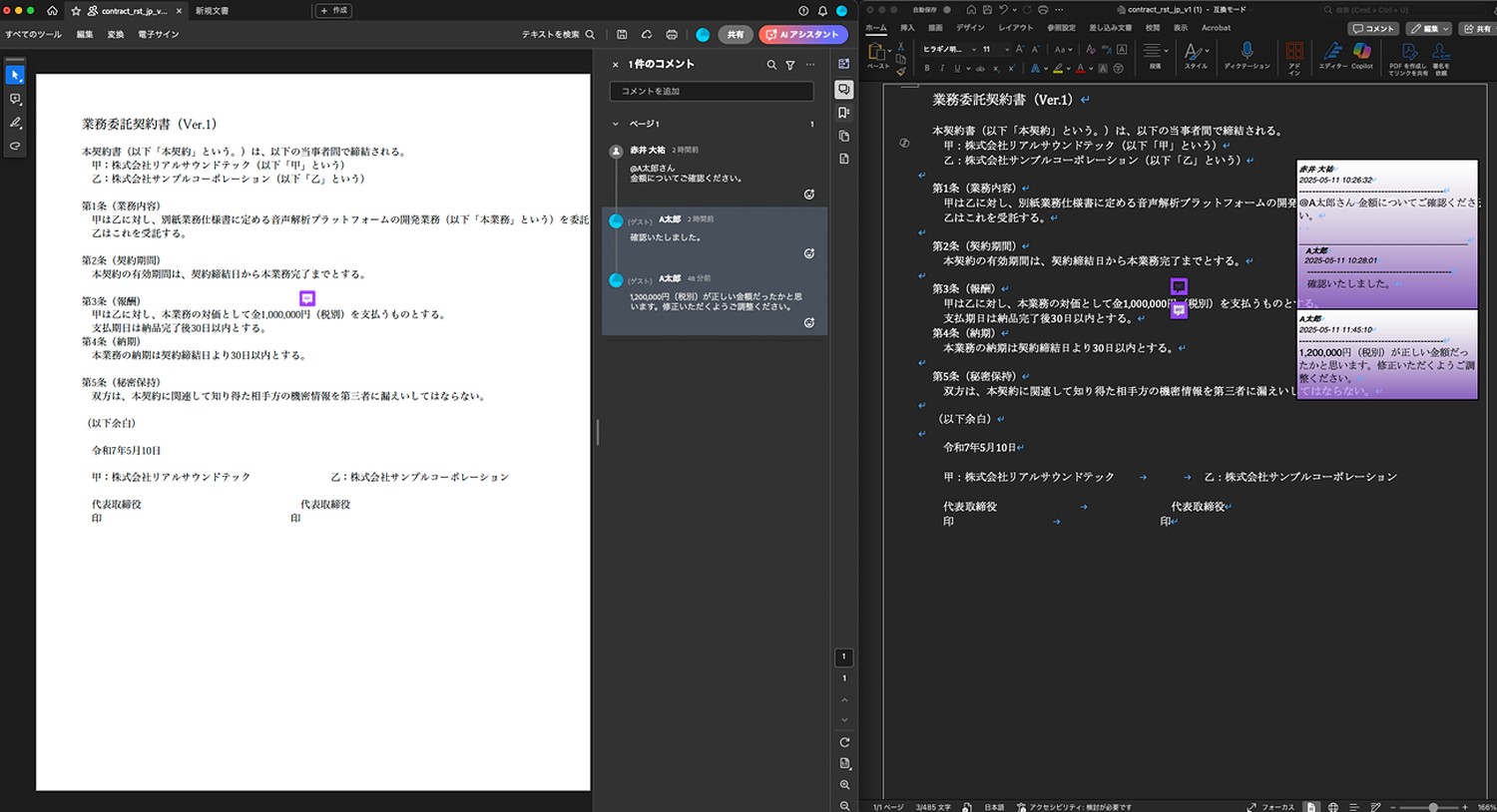 WordやPower PointのファイルをPDFとして書き出す機能は広く一般的に使用されているが、PDFファイルをWord、Power Point、Excel、画像形式など、よく利用される多くの形式で書き出すことも可能となる。たとえばこちら(左)のコメント入りのPDFをドキュメント形式として書き出すと、コメントが入った状態のWordファイル(右)となる。レイアウトのズレも発生しないので安心だ。