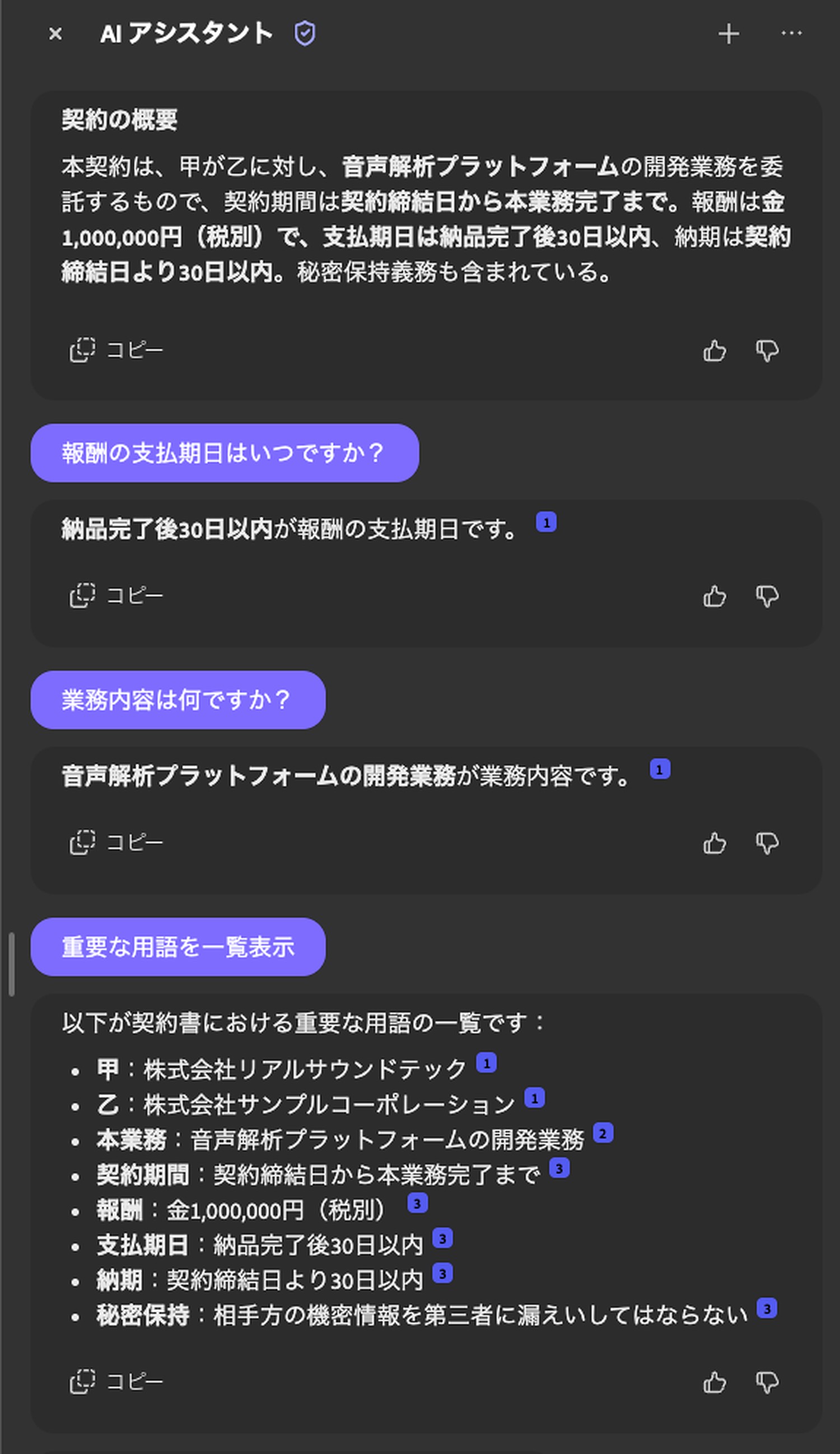 〈生成要約〉は、使用すると内容を読み取り、適切な形で要約してくれる。例えば受け取った契約書のチェックするべき箇所を、項目ごとに内容をわかりやすく提示してくれるなど、特定のシーンに対してしっかりチューニングが施されている。