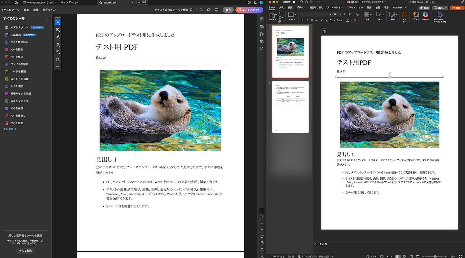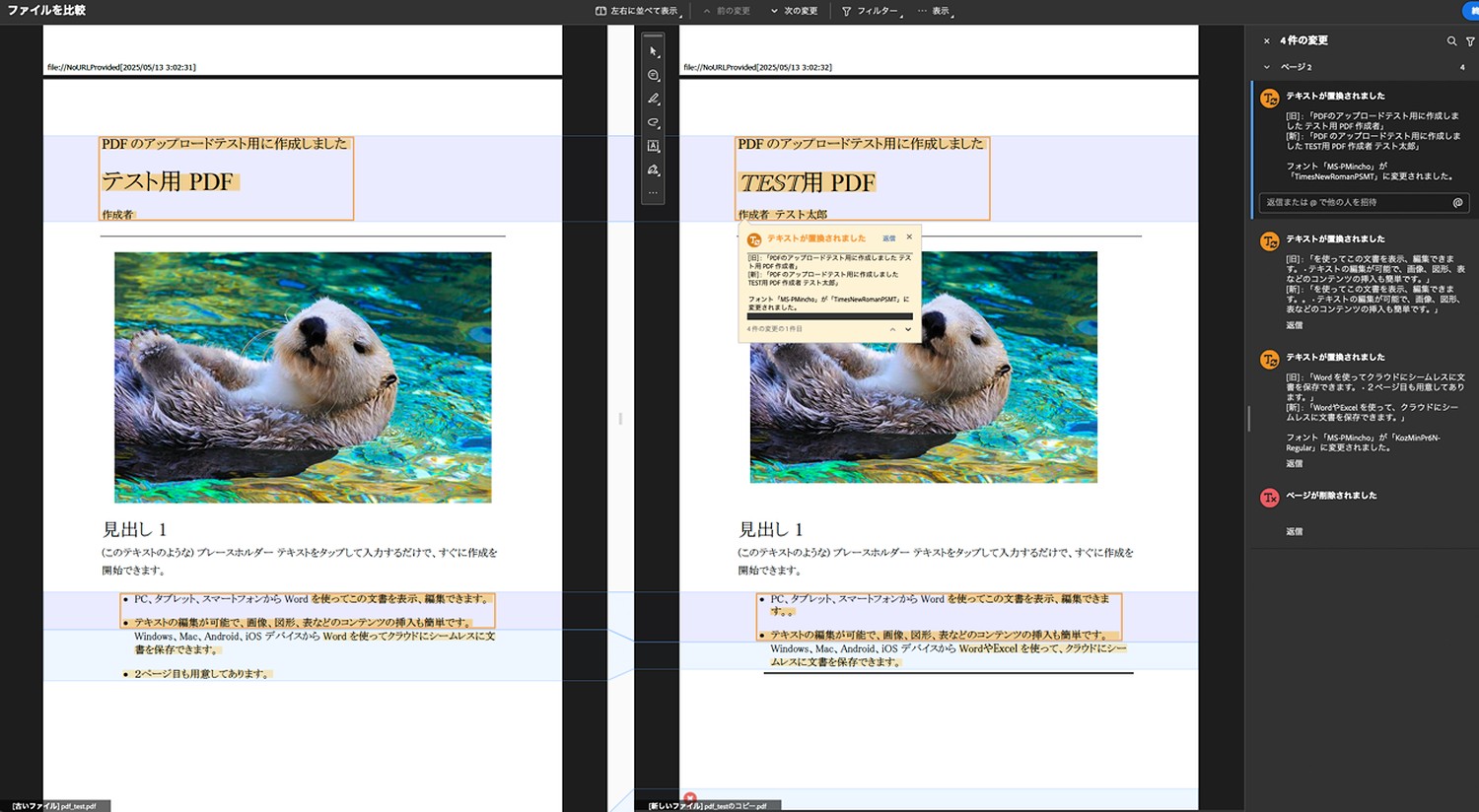 この機能を使うと、2つのPDFを並べて、どの部分がどのように変更されたのかが一目で確認できる。契約書や規約の改定箇所、雑誌や書籍のゲラチェック、入稿データの最終チェック、マニュアルの更新確認など、利用シーンは多岐にわたる。1ページだけならともかく、100ページ超のPDFなどを扱う際に読み合わせの必要もなくなる。さらに比較した状態を「比較レポート」として保存できるため、「どこが変更になったのか」といった説明の手間を省くこともできる。