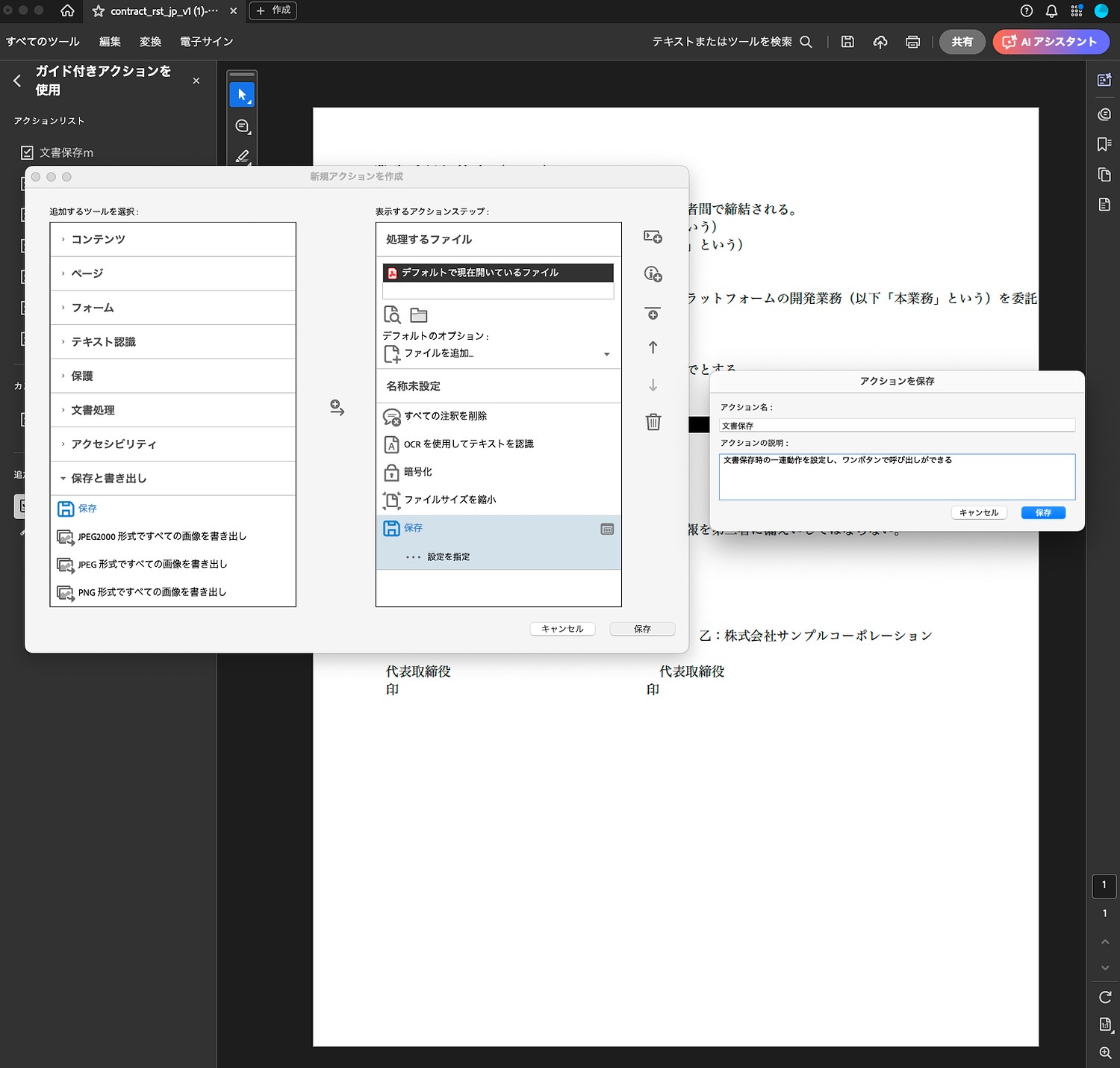〈アクション〉は一連の操作をレシピ化して一括実行する自動化機能だ。例えば「コメントを削除→OCR→暗号化→ファイルサイズを縮小→保存」といったルーチンをドラッグだけで登録し、複数のPDFに一括で適用できる。「カスタムコマンド」は単発の作業をワンクリック化する簡易マクロ機能だ。日々大量のPDFファイルを扱う業務においては間違いなく利用すべき機能だろう。