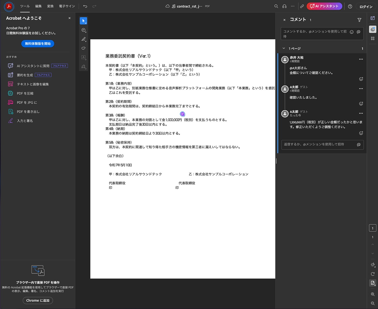 Acrobat上で開いたPDF上にコメントを入れることもできるので、社内や取引先と内容について確認したいときに活用しよう。