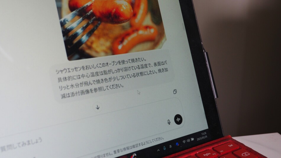 そして、「シャウエッセンを美味しく焼きたい。具体的には、中心は脂がしっかり溶けている温度で、表面はパリッと水分が飛んで焼き色が少しついている状態に。焼き加減は添付画像を参照」と打ち込んだ。すると、ChatGPTは以下のような回答を叩き出した。