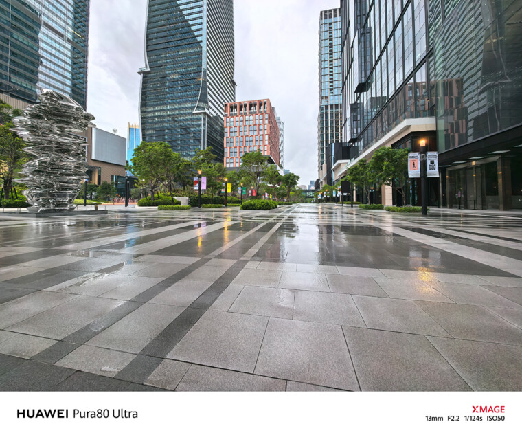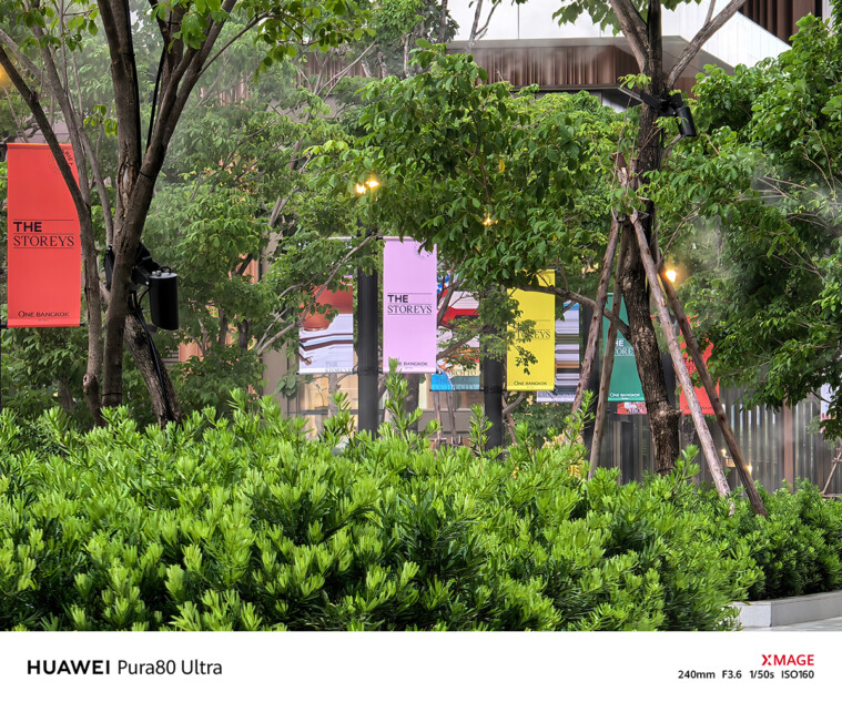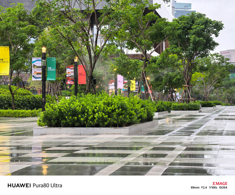 実際にカメラを切り替えて撮影してみた。場所はタイ・バンコクのショッピングモールだ。あいにくの小雨模様だったが、超広角カメラを使っても風景全体がどんよりとしてしまうことも無く、明るく撮影できる。