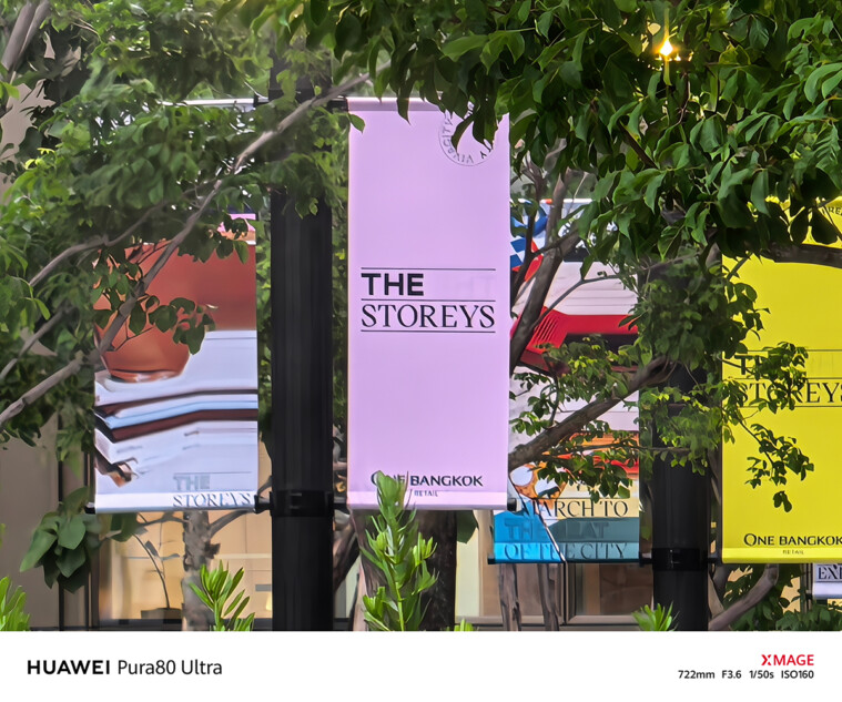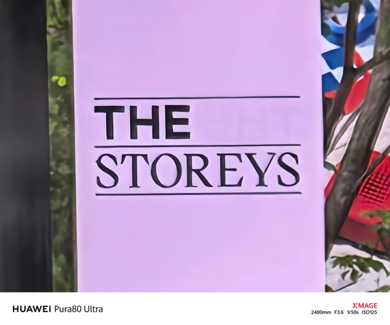 ではさらなる高倍率はどうだろうか? 10倍から上はデジタルズームとなる。またAI補正も10倍以上ではより強くなる。遠くにある垂れ幕を撮影してみたが、細かい文字はつぶれずしっかりと撮れていることがわかる。スマートフォンの高倍率撮影はあまり見られない絵が撮れることがあるが、これなら十分実用的だ。