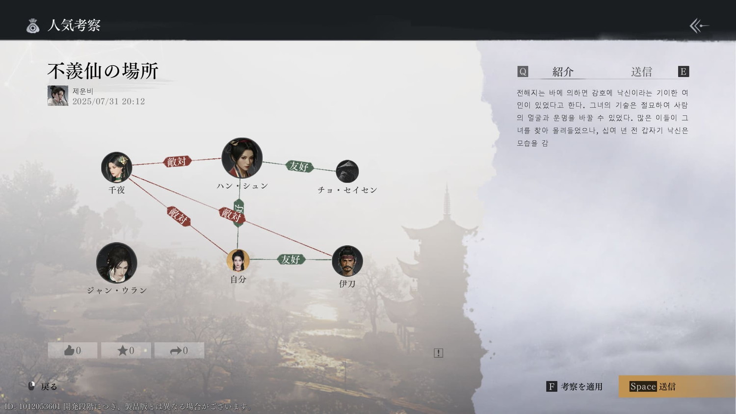『風燕伝』には、「訪れた場所や出会った人物を記録できる図鑑」が用意されており、自分なりの相関図やメモを作成することができる。そしてこの相関図やメモを自分ひとりで閲覧するだけでなく、オンラインを通じて他プレイヤーと考察を共有できる機能も実装されている。