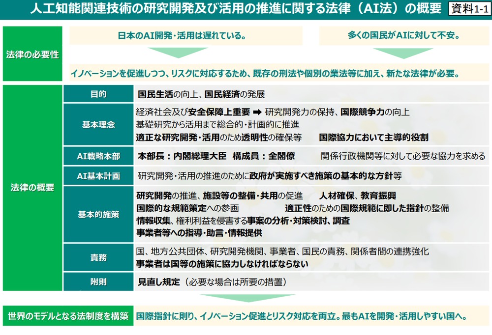 17の条文から構成されたAI法の内容は、内閣府直属のAI戦略会議が2025年6月2日に開催した会合において配布された資料「AI法の概要」(※2)に簡潔にまとめられている。