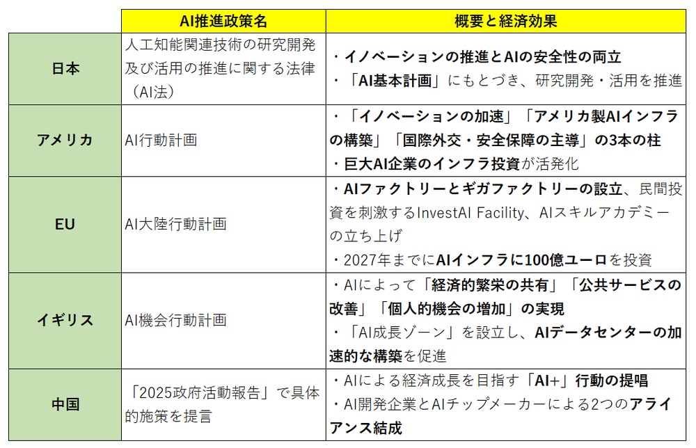 まずは本稿で取り上げる日本、アメリカ、EU、イギリス、そして中国のAI政策名、その概要と経済効果をまとめた表を掲載する。