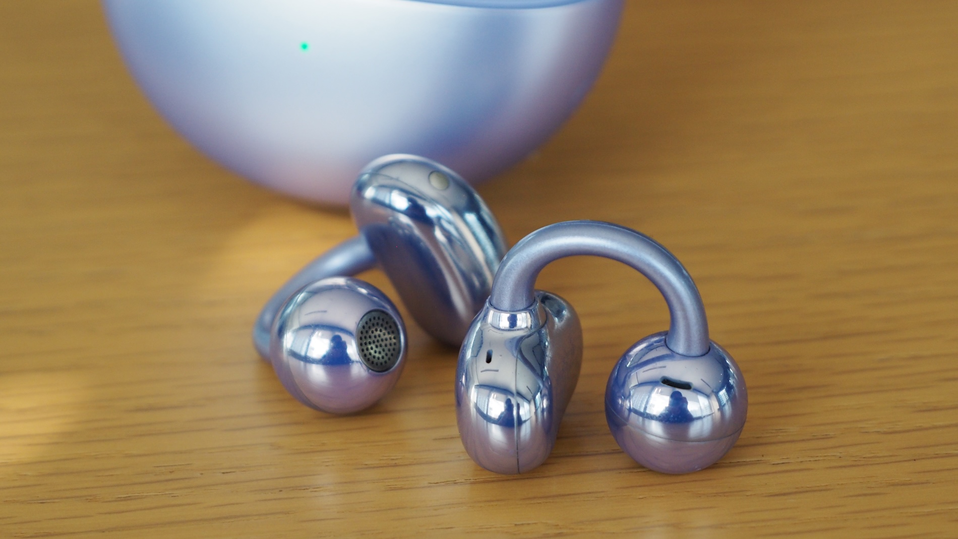 最大のポイントは優れた装着感で、本体は片方5.6gと、とにかく軽い! 充電ケースも45.5gしかないので、ポケットに入れて持ち歩いても気にならない。イヤホン本体は上に書いた通り、ふたつのパーツを形状記憶合金製ワイヤーでつないだ「C-bridge Design」を採用。耳を挟む強さも工夫されていて、長時間つけていても痛くならなかった。一方で、ジョギングやジムでの運動中に使ってもずれないくらいの安定性も備えている。